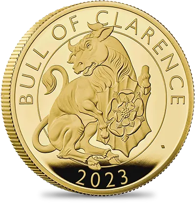 コインの裏面には、「クイーンズ・ビースト・コレクション」のデザインとはまた異なった角度からこの動物を捉えたデビッド・ローレンスによる躍動感溢れる現代的な解釈が見られます。牛の胸元には「テューダー・ローズ」の名称で知られる紅白の薔薇から成る古風な紋章が刻まれています。