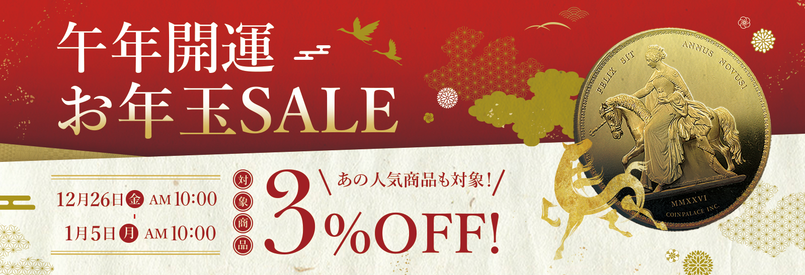 ご挨拶 新年明けましておめでとうございます。株式会社コインパレスの森でございます。 お正月は皆さまいかがお過ごしでしょうか。 現在開催中の「午年開運お年玉セール」は1月5日10時までとなります。気になるアンティークコインやモダンコインがなんと3%OFF! ...