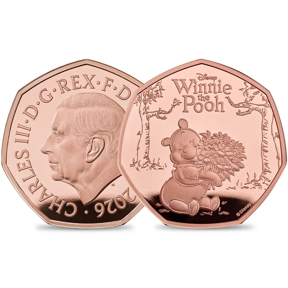 本コインは、英国50ペンス貨として発行され、裏面デザインにはウォルト・ディズニー・カンパニーによる、勇気あるプーさんの姿が描かれています。