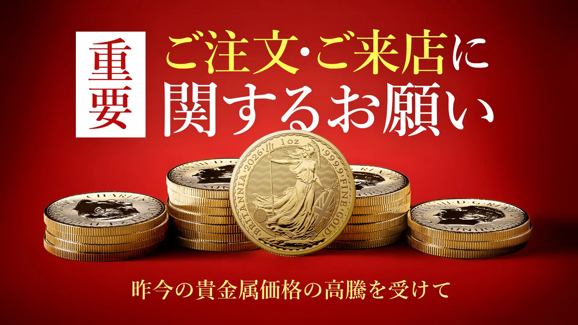 平素より格別のご高配を賜り厚く御礼申し上げます。 昨今の貴金属価格の高騰と市場環境により、連日、弊社コインパレスでは非常に多くのご注文を頂戴しております。 当面の間、急激な在庫変動やお電話が繋がりにくいなどの状況が続...